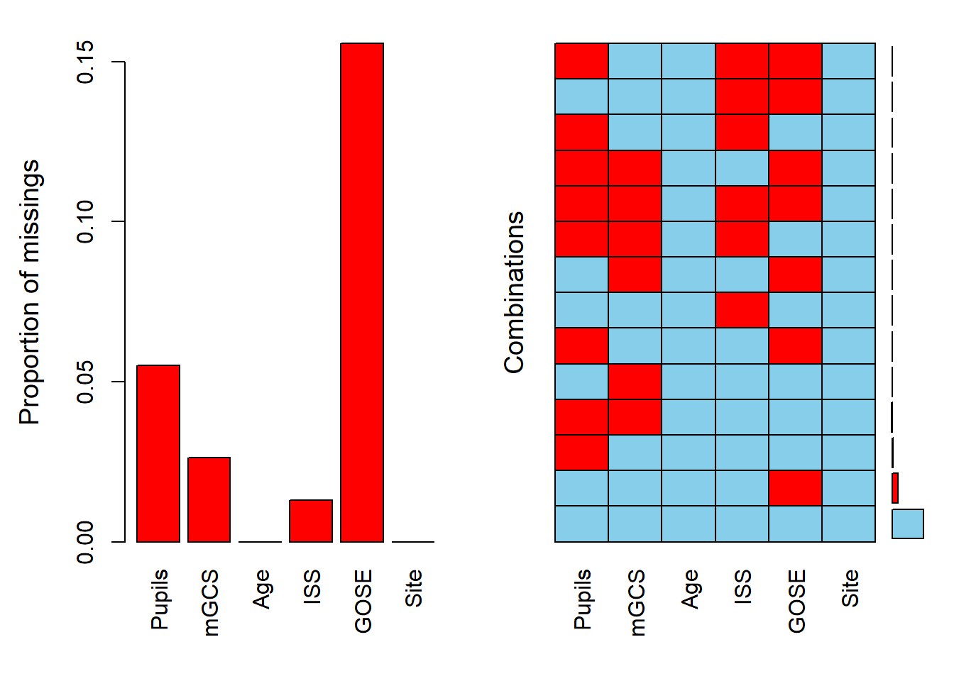 ## glm(formula = I(is.na(mGCS)) ~ Pupils + Age + ISS + GOSE, family = "binomial",